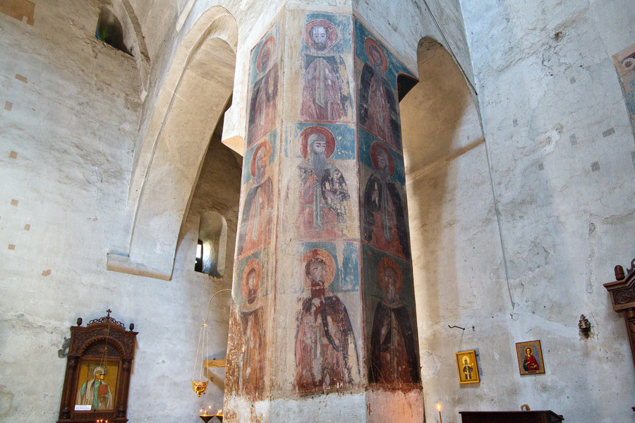 Главное достоинство крепости Ананури – это ее относительная сохранность: за несколько столетий не рухнули каменные стены и башни и даже некоторые перекрытия остались. Все еще можно лицезреть Успенский и Спасский Храм со старинными фресками, звонницу, главную башню и баню.